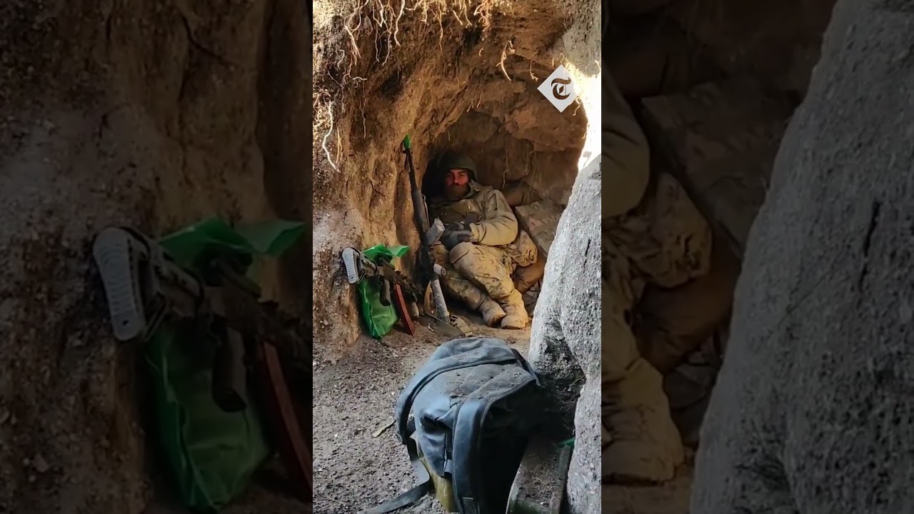 Two Ukrainian soldiers shelter in a trench as they protect themselves from Russian missiles. It is not clear where the video was …